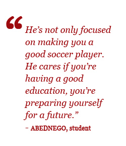 Supporting athletes as students Coach Gucciardi has begun exploring ways to intentionally integrate academic vocabulary—such as “evidence” and “analysis”—into the language of soccer practice. In the meantime, he and his coaching colleagues act as steadfast champions of the habits students must build in order to succeed at their coursework. Students regularly do homework at the tables that fill the Soccer Without Borders office, with help readily available. “He’s not only focused on making you a good soccer player,” said Abednego, who comes from Guatemala and aspires to be a lawyer. “He’s also focusing on making you a successful person for the future. He don’t care if you Omar described an occasion on which Mr. Gucciardi took a group of players to the home of a struggling teammate who had given up on school. “We went to talk to him, try and make him go back to finish high school, see how important it is to have a high school diploma in life,” he recalled. For another player, who was strong in both soccer and academics, the coach made sure he visited university programs and met the deadlines for college entrance exams. “Who does that for you?!” Omar exclaimed. “It’s amazing. And he treats equally everybody. [He says to us,] ‘Obviously you can apply too. You’re going to make it.’” Soccer Without Borders considers such support part of its core mission. Though players may struggle with academics or have issues with classroom behavior, “they are also very invested in soccer,” said Mr. Gucciardi. “To help them stay focused, we can leverage their participation on the team with some academic outcomes.” At such an intervention, student, family, and teachers typically confer together to agree on a plan and fair consequences —such as losing the right to play in games or at practices—if transgressions occur. In other cases, students who have dropped out maintain their connection with learning through soccer practice. One such student, now 21, left school in eleventh grade and “still comes all the time,” said Mr. Gucciardi. “He’s now finally decided he really wants to finish his GED, so he’s coming here to get help and support.” Such lasting bonds at once affirm and extend the culture of growth, opportunity, and empowerment the program seeks to create, the coach reflected. “We’re getting more intentional about that all the time.”