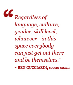 Creating bonds of mutual support By bringing together peers who may not otherwise meet in academic classes, students made clear, the soccer program expands their social network. “If we see each other outside practice, we say hi to each other and ask about how the classes are going,” Helen said. Playing together also deepens their sense of emotional safety. “We’ve got to know each other here,” said Emory. “We don’t fight. We are like a team, a family, and we feel safe.” Such cross-cultural friendships are the program’s most important outcome, Ben Gucciardi believes. For many students, he said, “the first time they build relationships outside of their language group is on the soccer field.” He told of an Arabic speaker in tenth grade:
