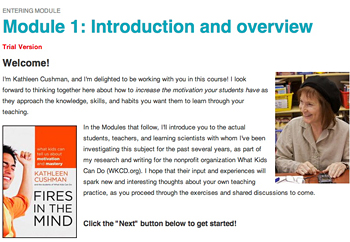 Online Lesson Study to Build Student Motivation Educators inspired to boost student motivation after reading WKCD’s recent book Fires in the Mind now have new support in making that happen. In a self-paced, online “Learning Path on Building Student Motivation,” author Kathleen Cushman presents six in-depth mixed-media case studies of highly motivating classroom practice—complete with commentary from learning scientists as well as from the teachers and students involved. That material forms the core of a collaborative social-learning experience that takes only six to eight hours of “anytime, anywhere” study. Small cohorts of participants hear from Cushman, analyze curriculum and instruction through the lens of the “Motivation Equation,” and come to new insights in a discussion forum. Participants keep a portfolio that aligns their work with the Danielson Teacher Effectiveness Rubric. COURSE OBJECTIVES • Understand the factors that are crucial to motivation • Develop skills for improving student expectations of success • Identify and apply the “building blocks of motivation and mastery” to the teaching and learning environment • Share classroom approaches to maintaining and increasing student motivation. |