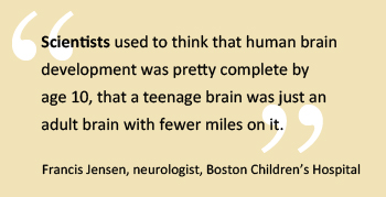 It will come as no surprise that the adolescent brain is often described as “still immature” or “maturing.” These are kind labels for not-so-kind behaviors: mood swings, surliness, impulsivity, poor decisions, insensitivity (or too much sensitivity), and more. Parents and teachers wish that lectures, rewards, and punishments would turn these difficult behaviors around. Neuroscience research explains why they persist.